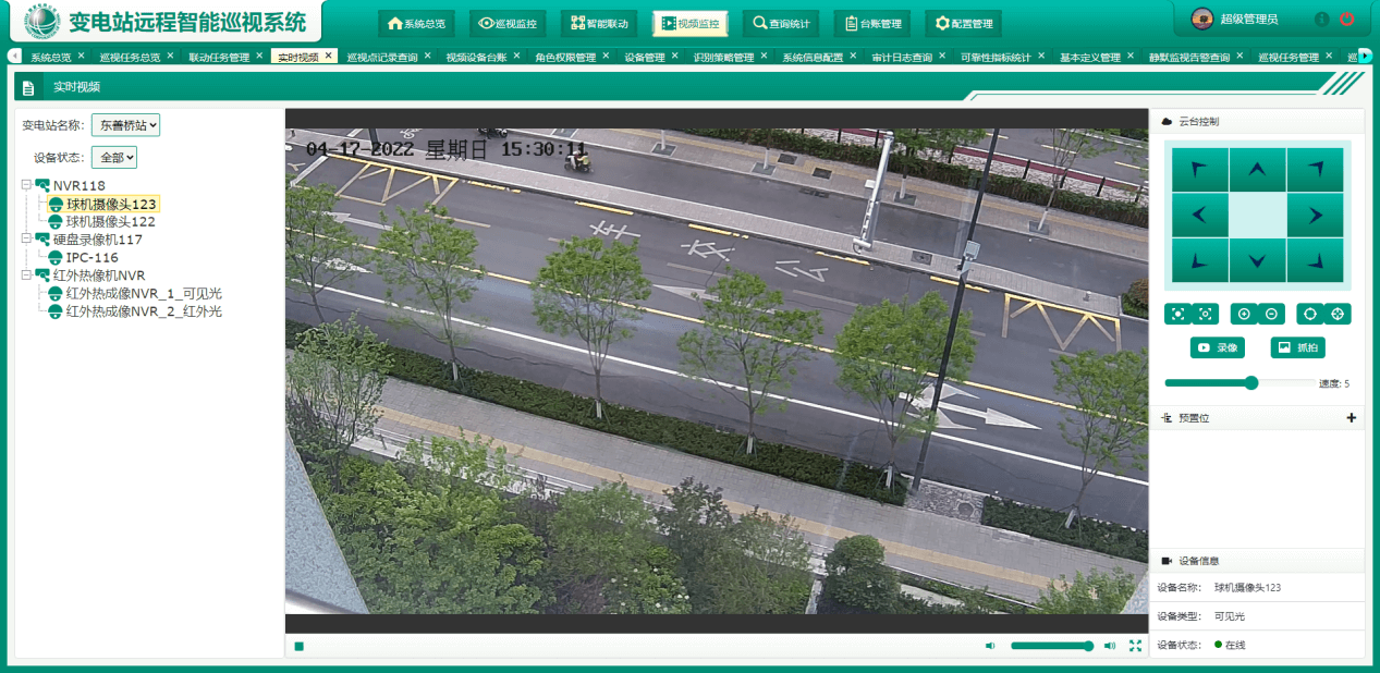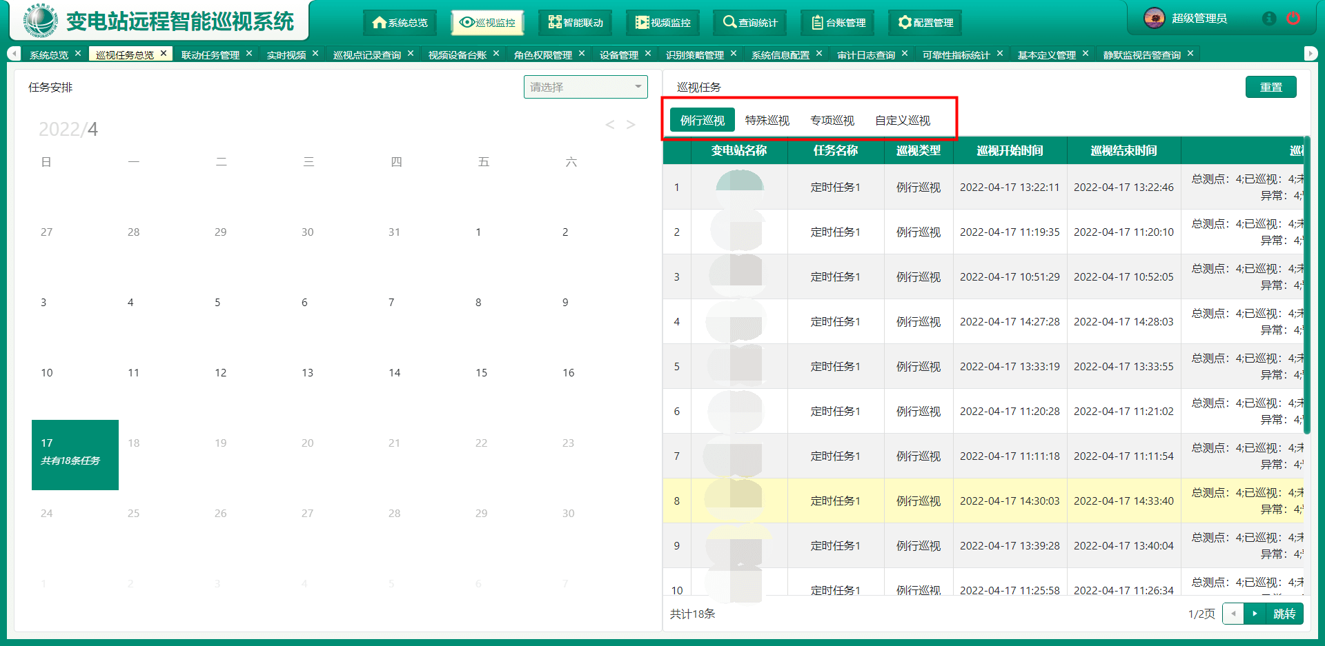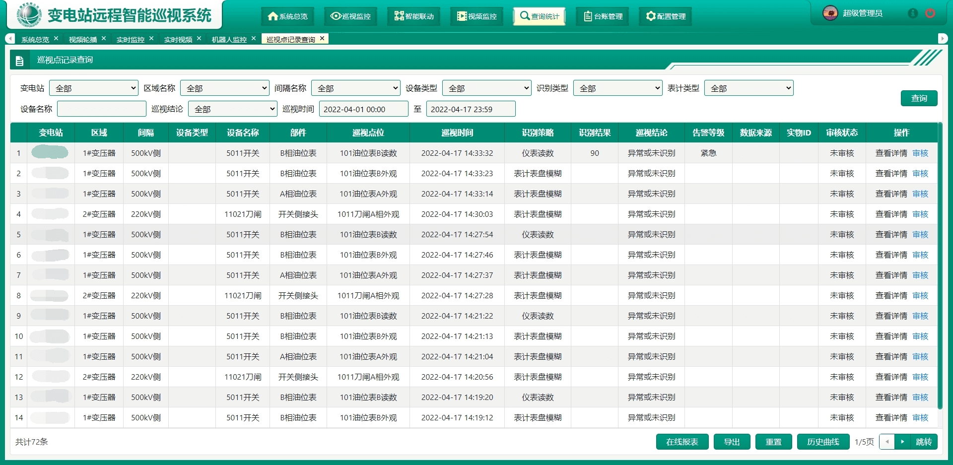 Through the application of artificial intelligence technology, the intelligent recognition, automatic classification and data analysis of visual inspection images can be realized, and with the formulation of autonomous inspection tasks, routine inspections, special inspections, dedicated inspections, custom inspections and silent monitoring can be realized, so as to effectively reduce the workload and inspection stress of the operation and maintenance personnel.