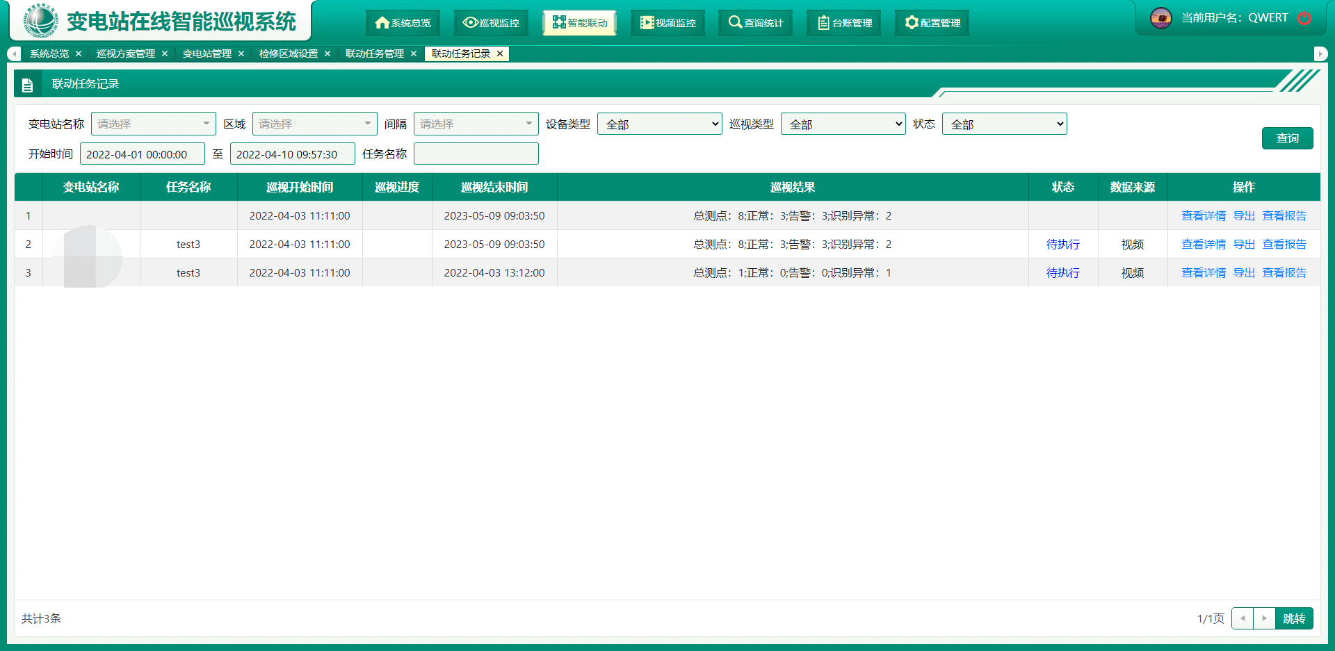 The remote intelligent patrol system obtains the monitoring data of the monitoring system of the main and auxiliary equipment, and integrates the monitoring information of the main and auxiliary equipment, so as to realize the linkage function between the main and auxiliary equipment and the patrol system: (1) Realize the linkage between the displacement signal and the protection alarm signal of the SCADA monitoring system of the main equipment; (2) Realize the linkage function with the auxiliary control system weather, fire protection, security, access control and other states; (3) Realize the linkage function with the one-key sequence control system.